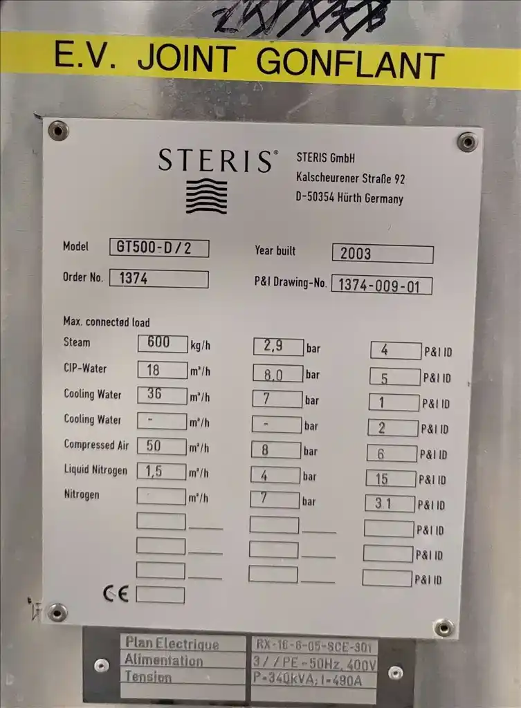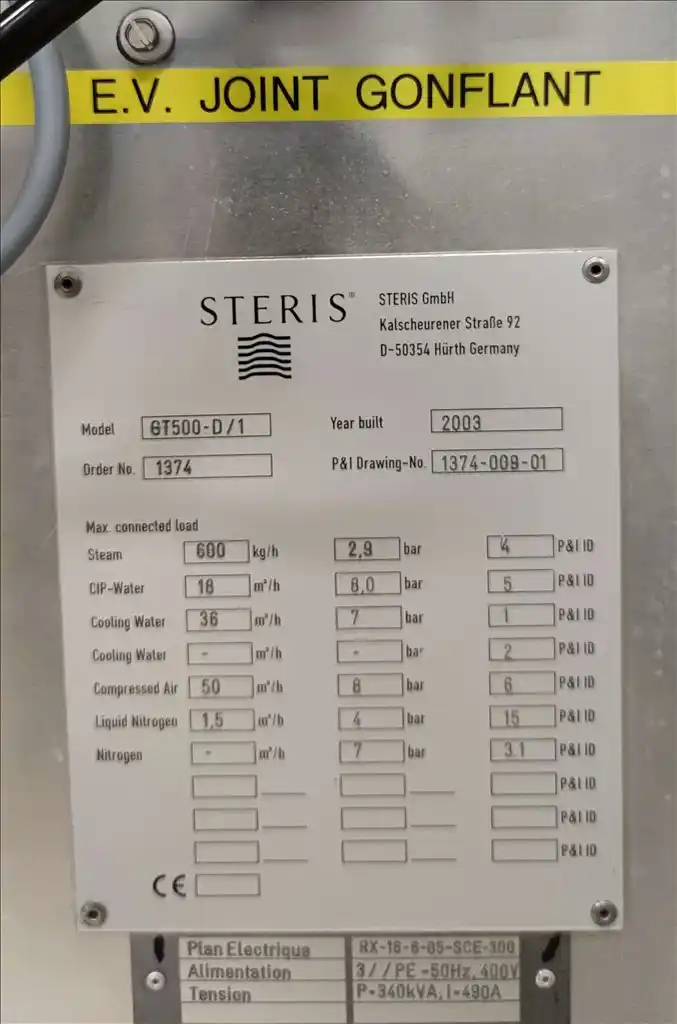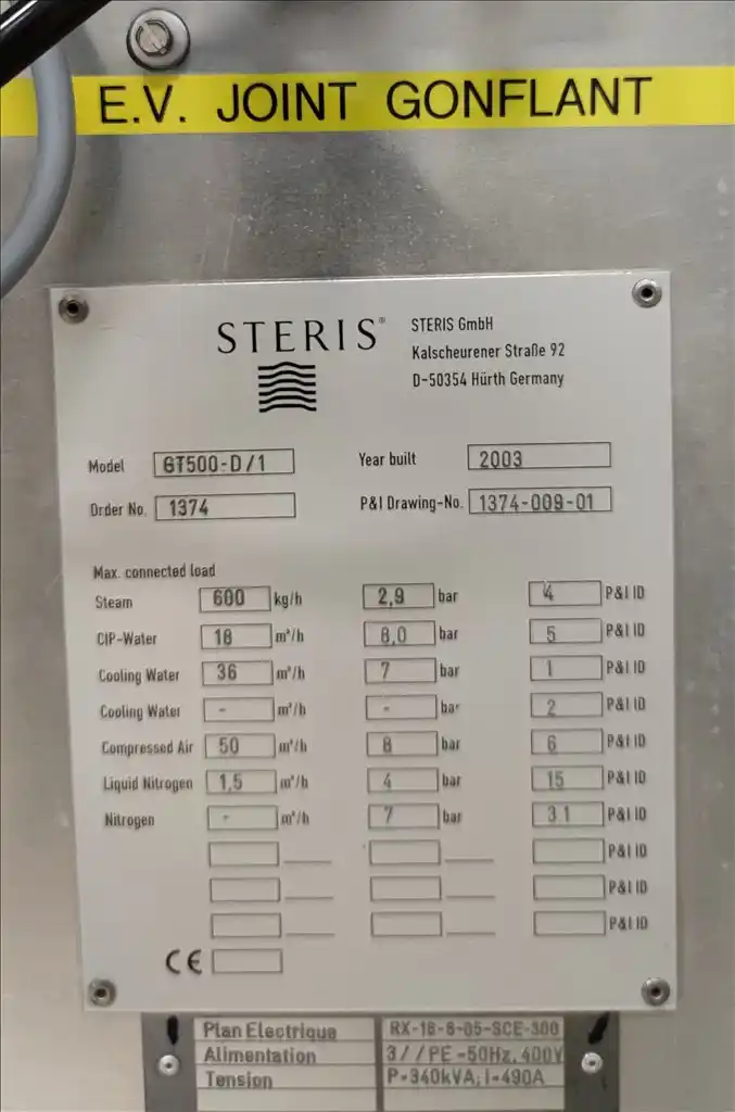 LYOPHILIZER. BRAND STERIS-FINNAQUA. MODEL GT500-D/2. YOM 03/01/2002. S/N 1374/2. CAPACITY 150.000 VIALS @ 3 ML. VIAL MULTI FORMAT. THE SHELF SPACE INSIDE THE LYO CHAMBER IS 3.339.670 MM², OR 3,34 M²