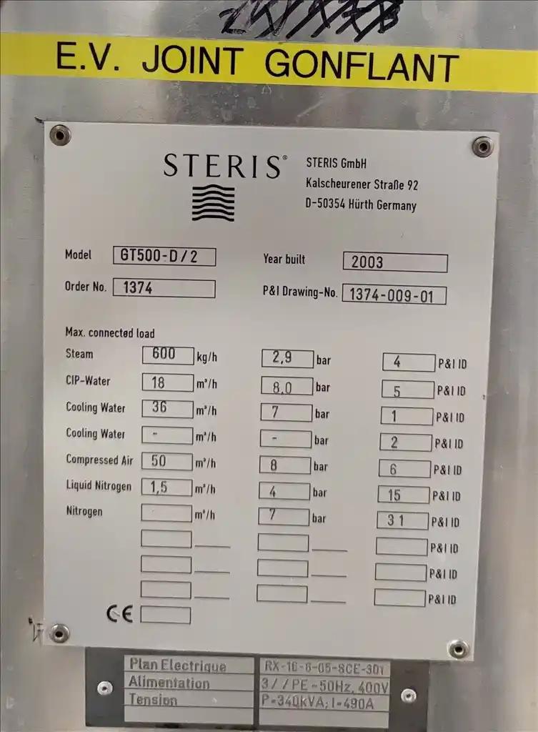 Lyophilizer. Brand Steris-Finnaqua. Model GT500-D/2. YOM 03/01/2002. S/N 1374/2. Capacity 150.000 Vials @ 3 ML. Vial Multi Format. THE Shelf Space Inside THE LYO Chamber IS 3.339.670 MM², OR 3,34 M²