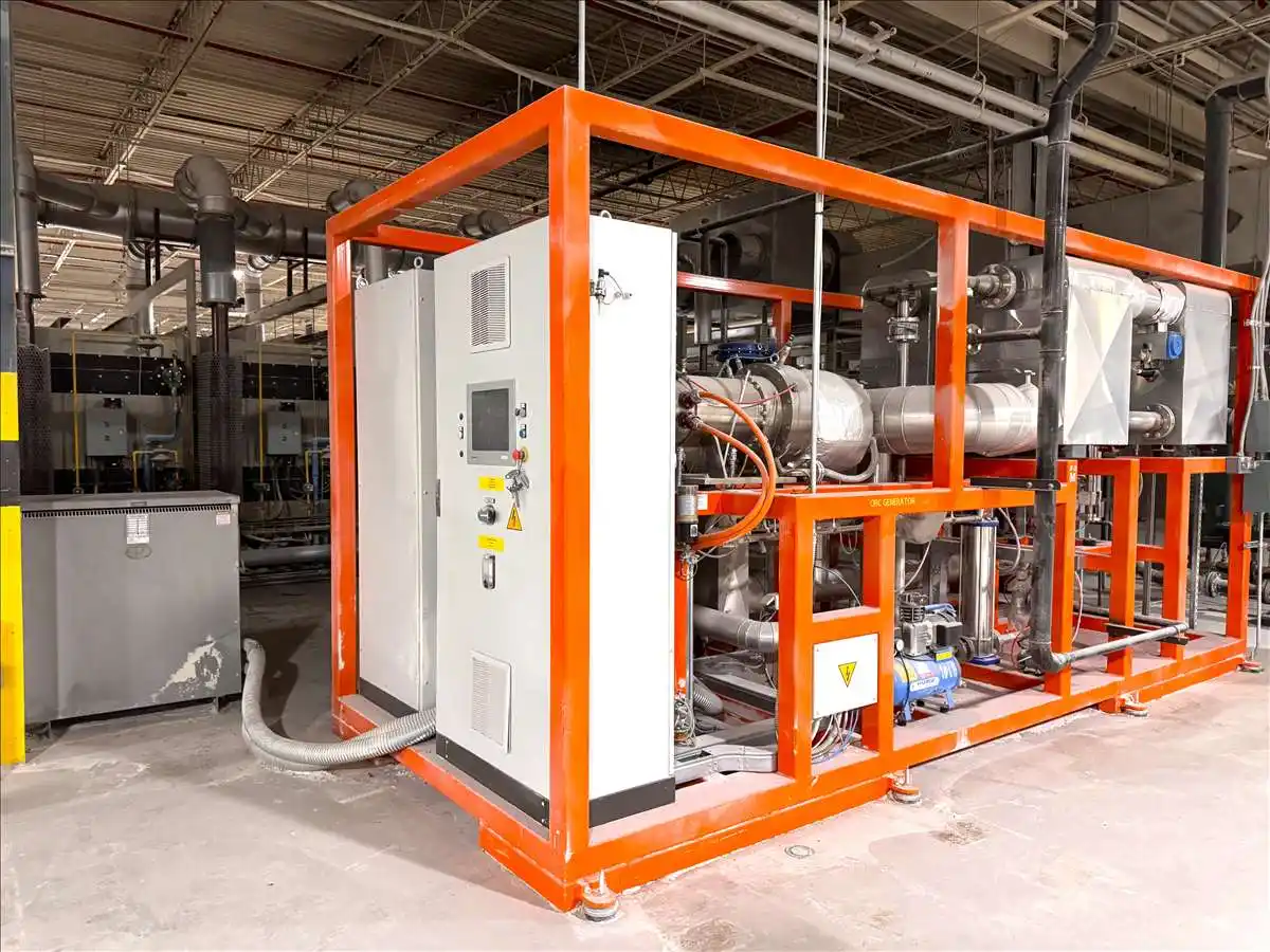 This Zuccato Energy LT-Series Organic Rankine Cycle (ORC) waste heat recovery system is designed to convert excess thermal energy into usable electricity in heat-intensive industrial environments. Suitable for integration with furnaces, kilns, dryers, and other continuous process equipment, ORC systems recover waste heat from exhaust streams and transform it into supplemental power to improve overall plant efficiency. This unit was installed as part of an industrial processing facility and is well suited for cement, lime, mineral processing, chemical processing, glass, and other operations seeking to reduce wasted thermal output and improve energy utilization. Integrator-related system components may reference ClearPower Systems, while the core ORC module is manufactured by Zuccato Energy.